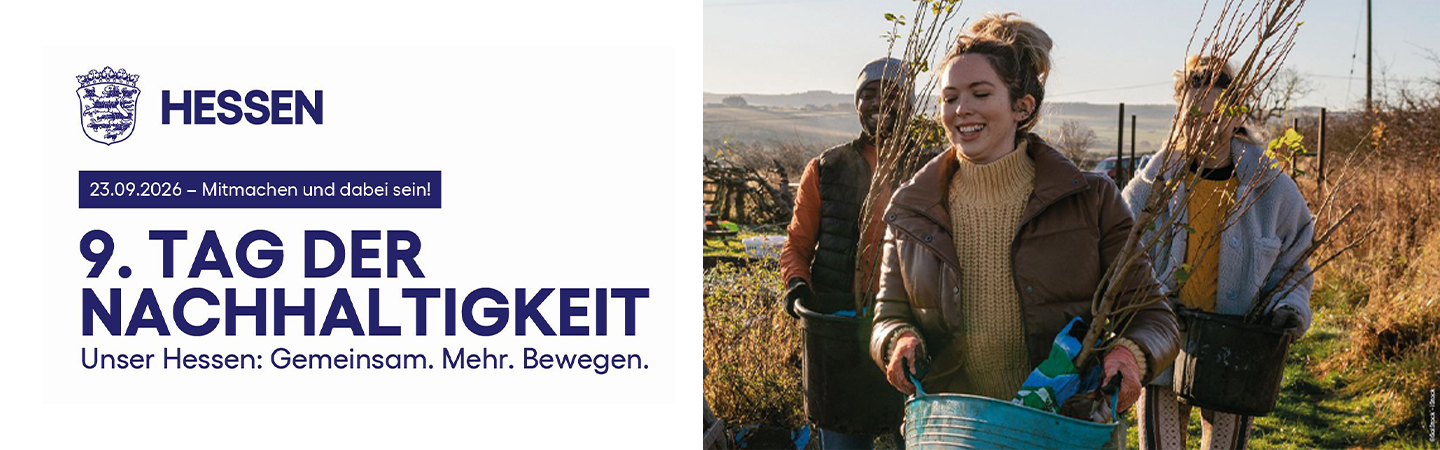 Der 9. Tag der Nachhaltigkeit Hessen (TdNH) findet am Mittwoch, 23. September 2026, statt. Ganz im Sinne unseres diesjährigen Mottos „Unser Hessen: Gemeinsam. Mehr. Bewegen.“ laden wir dazu ein, neue Impulse zu setzen, Gewohnheiten zu hinterfragen und ins Handeln zu kommen – für mehr Vielfalt, mehr Miteinander und mehr nachhaltige Entwicklung.